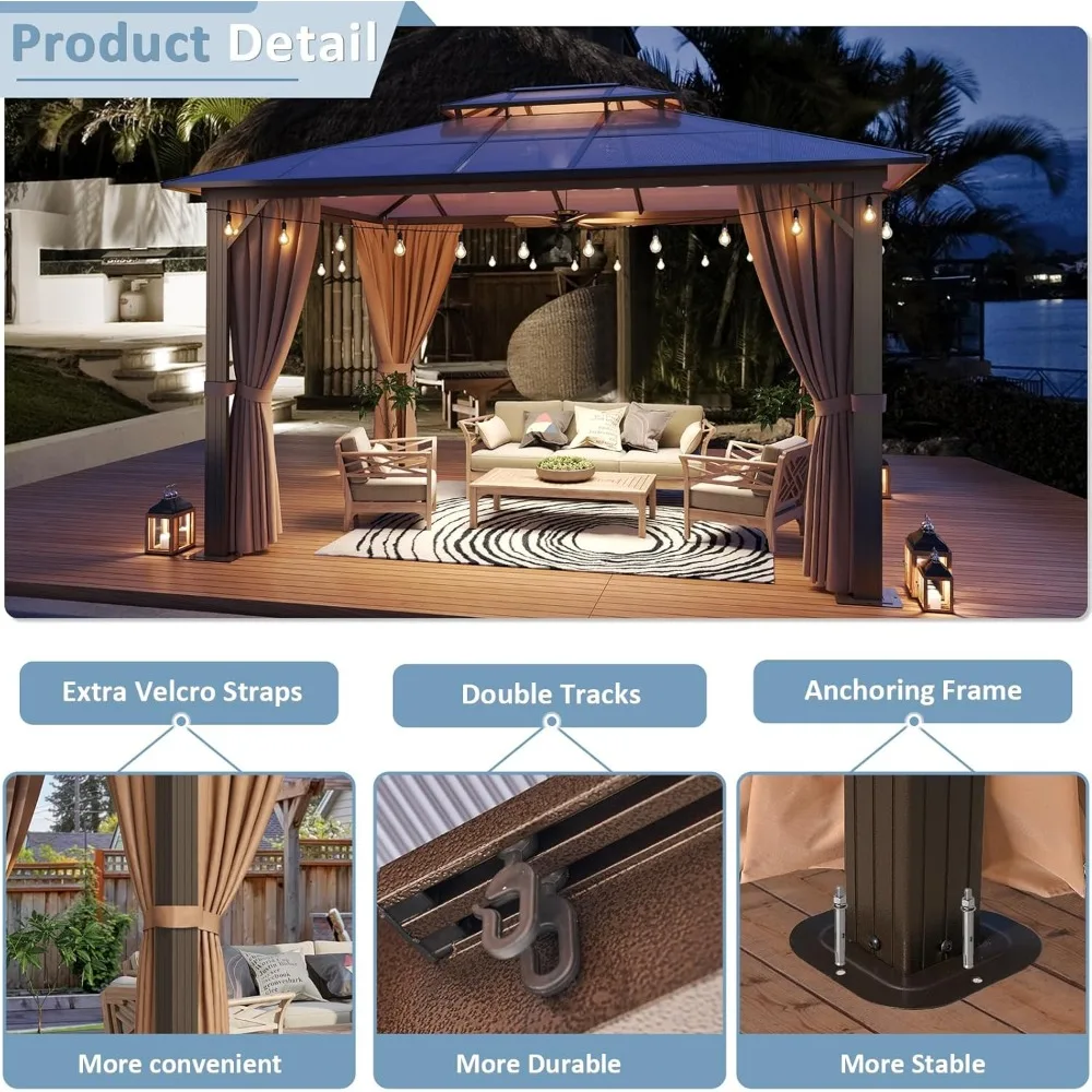 - 【Curtains & Netting】The design of anti-mosquito net can create a more comfortable environment, allowing you to relax and enjoy your time in the gazebo without the constant annoyance of mosquitoes or flies. Also, made by 180g polyester curtains, the hardtop gazebo can provide privacy, keep warm in cold occasions. On the other hand, it has open view and sufficient airflow with the 40g zippered netting. Top hooks enable users to hang fans or other decorations.