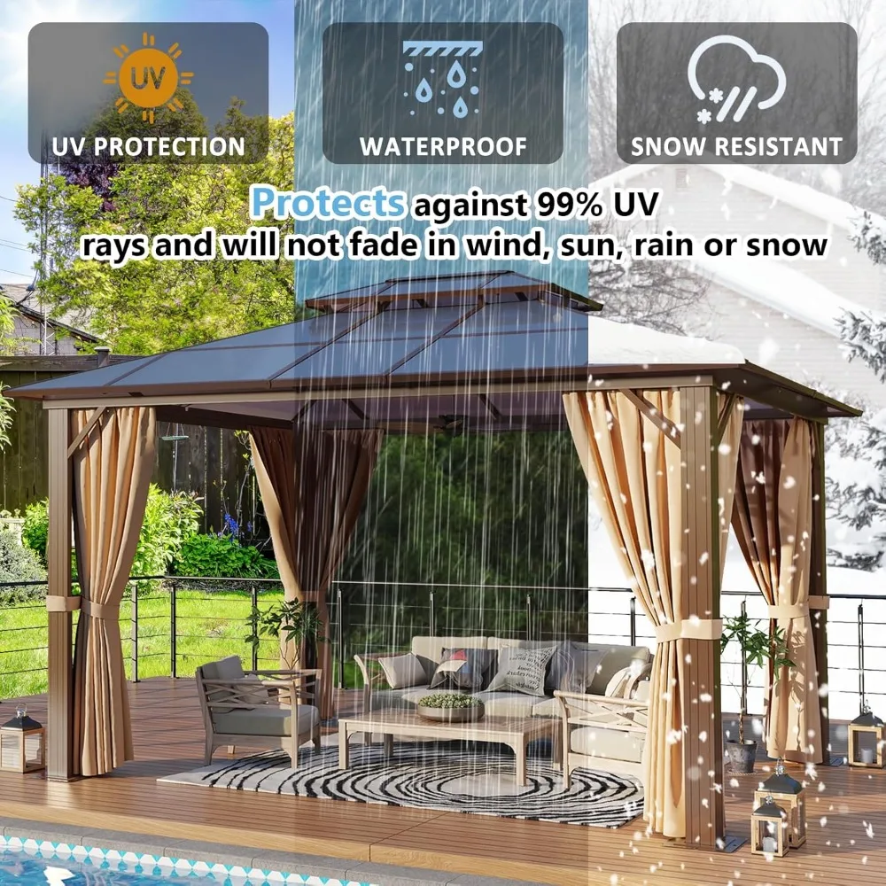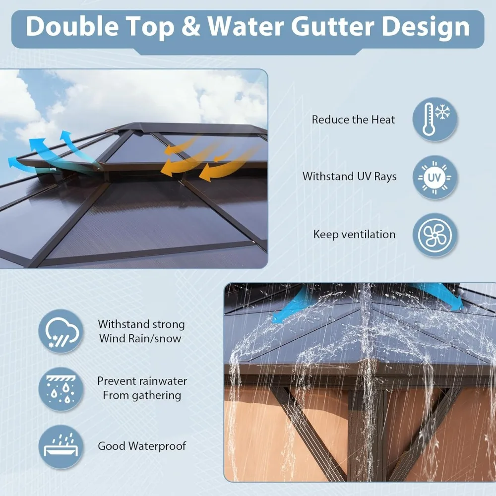 - 【Double Top Design】The gazebo featuring double top provides better insulation, creating a more comfortable environment. It helps better airflow and ventilation within the gazebo and also adds visual interest and elegance to the structure. (Note:The polycarbonate panel is translucent)