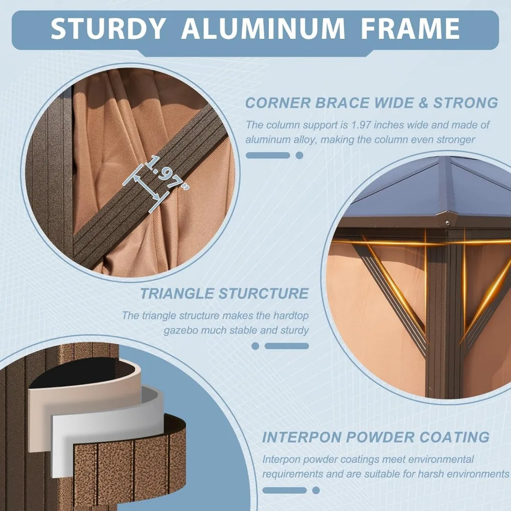 - 【Durable and Sturdy Aluminum Frame】Our product has triangular structure that greatly enhance the overall stability and durability. This patio gazebo is designed in sturdy aluminum frames with more environmentally friendly, high performance, high weather resistance premium Interpon AkzoNobel powder coat that is not easy to scratch, peel, corrode, or rust. Expansion screws are provided.