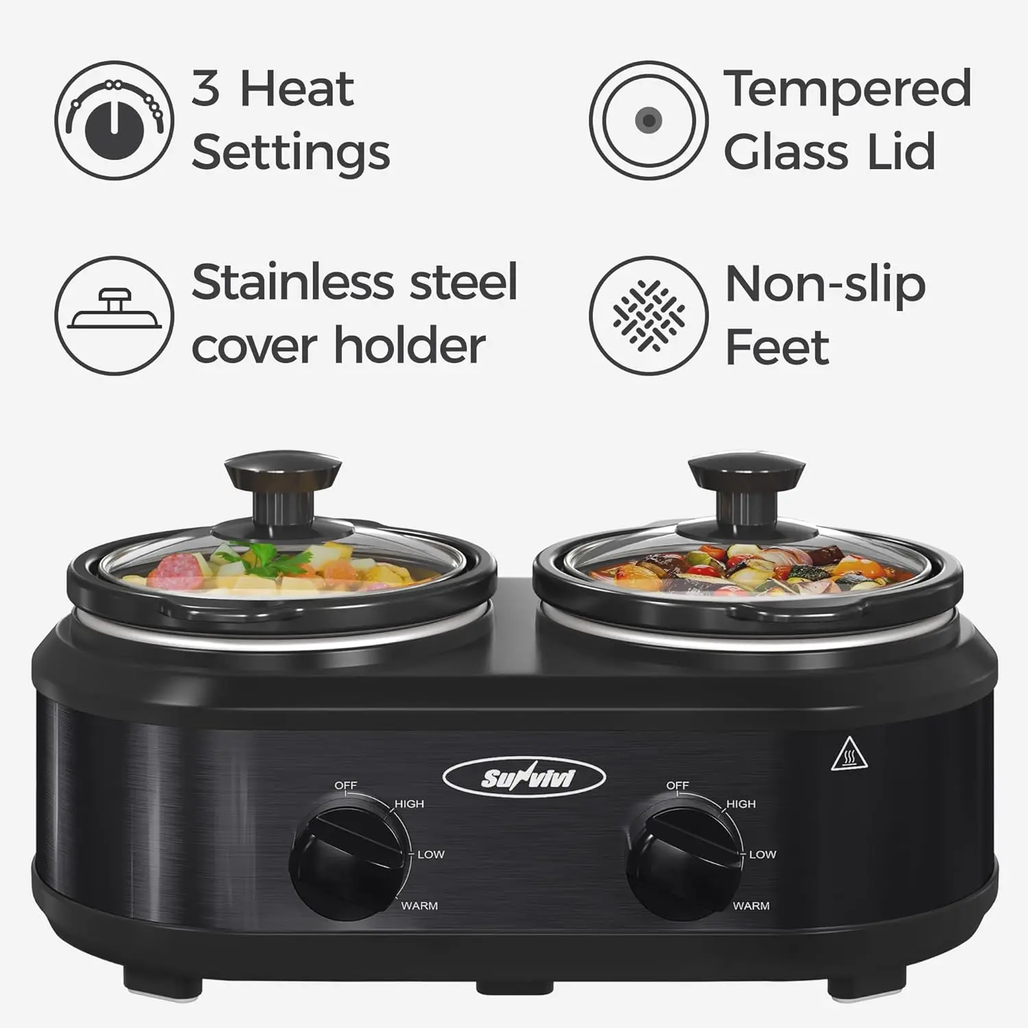 - [OVERHEAT PROTECTION] - Each crock has its own heating element with three settings, high, low, and warm, choose high temperature to cook sirloin potatoes, chicken soup, and rice, heat preservation to keep the food at a constant temperature, or use low temperature to heat chocolate and cheese. No matter which temperature mode you choose, we will ensure the temperature and humidity of the food. It will not cause the moisture loss of the food and maintain the best taste.