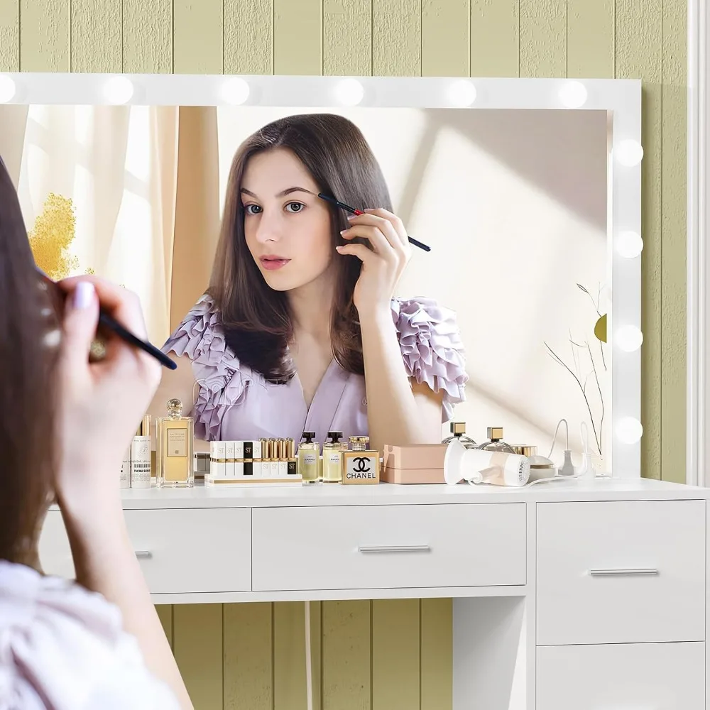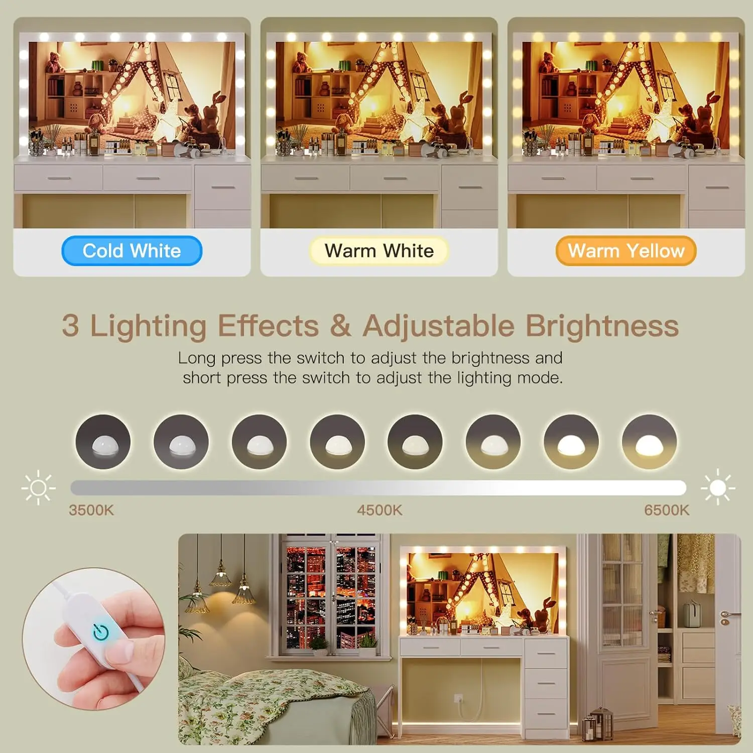 Configuration Upgrade! 47.2" Extended Vanity Desk+14 LED Lights+Large Vanity Mirror: The full size makeup vanity mirror(Mirror Size: 43.3"L*23.6"W) matching 14 lights with 3 color & brightness adjustable, makes the light brighter and uniformity while providing wider makeup view. It's an all-around upgraded makeup vanity table! No longer need to get close to the small mirror to get the best makeup angle & completing the exquisite makeup with an elegant posture in a short time