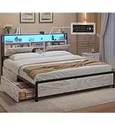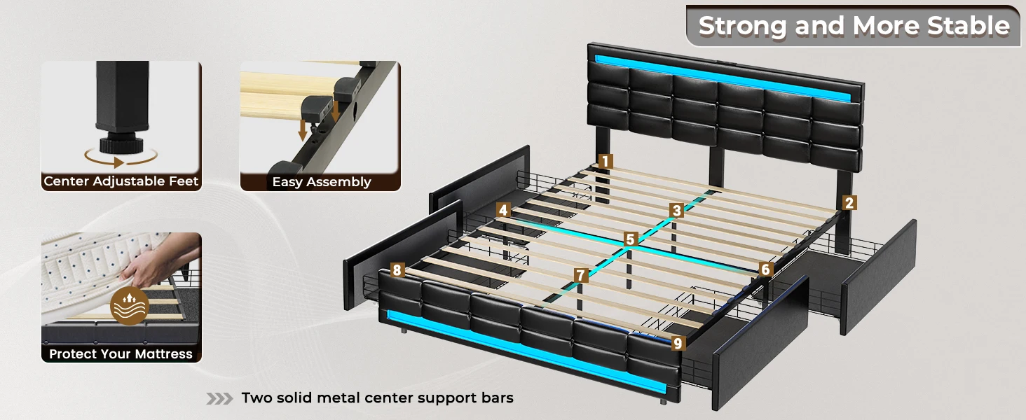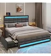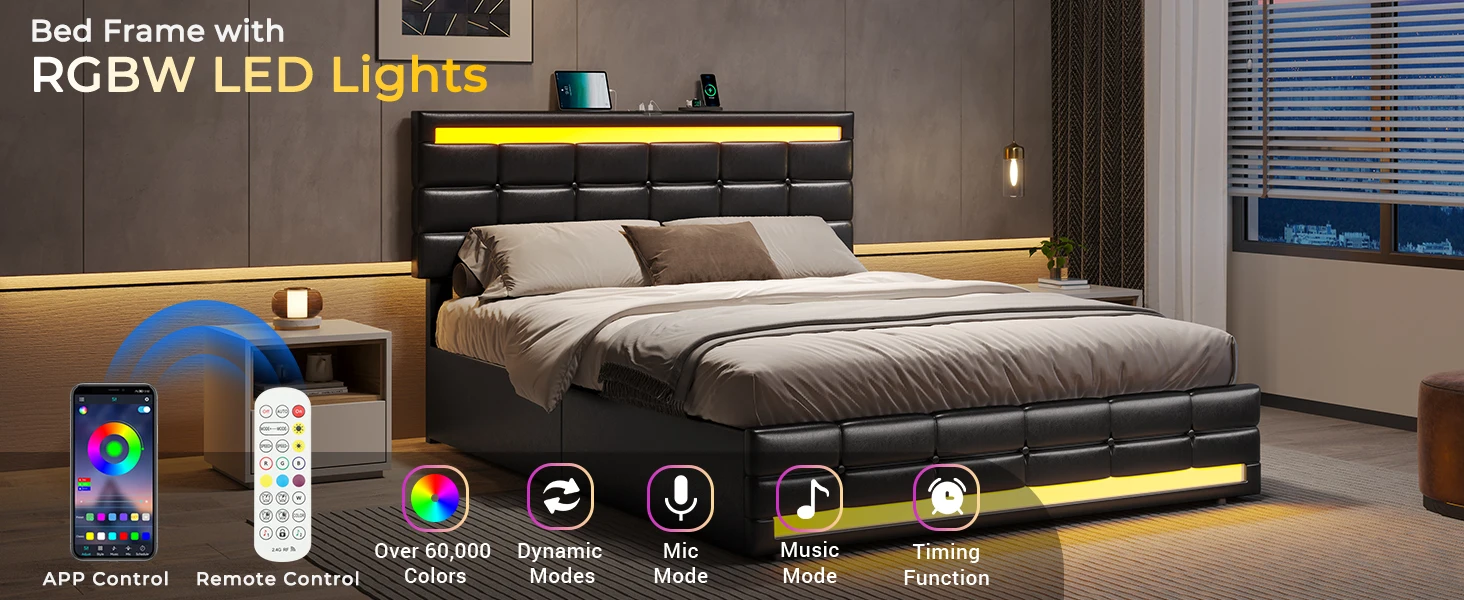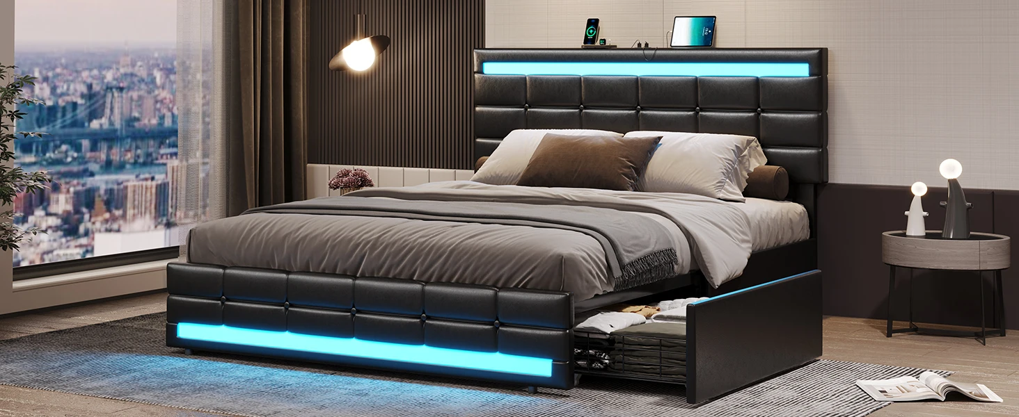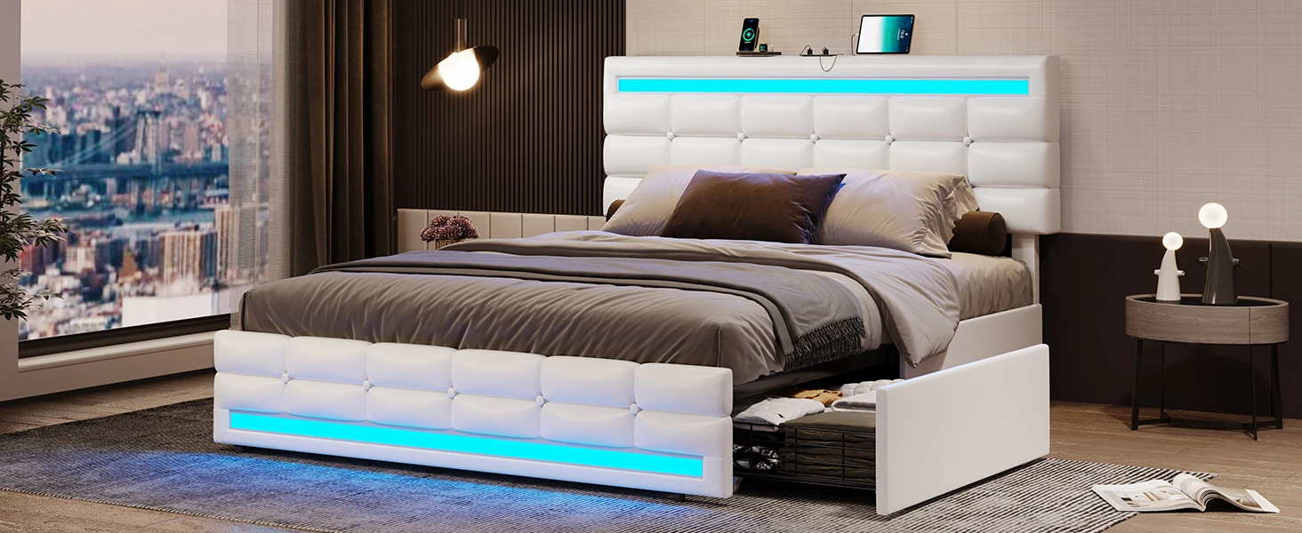 Modern Smart Platform Bed Frame with LED Lights & Storage Drawers