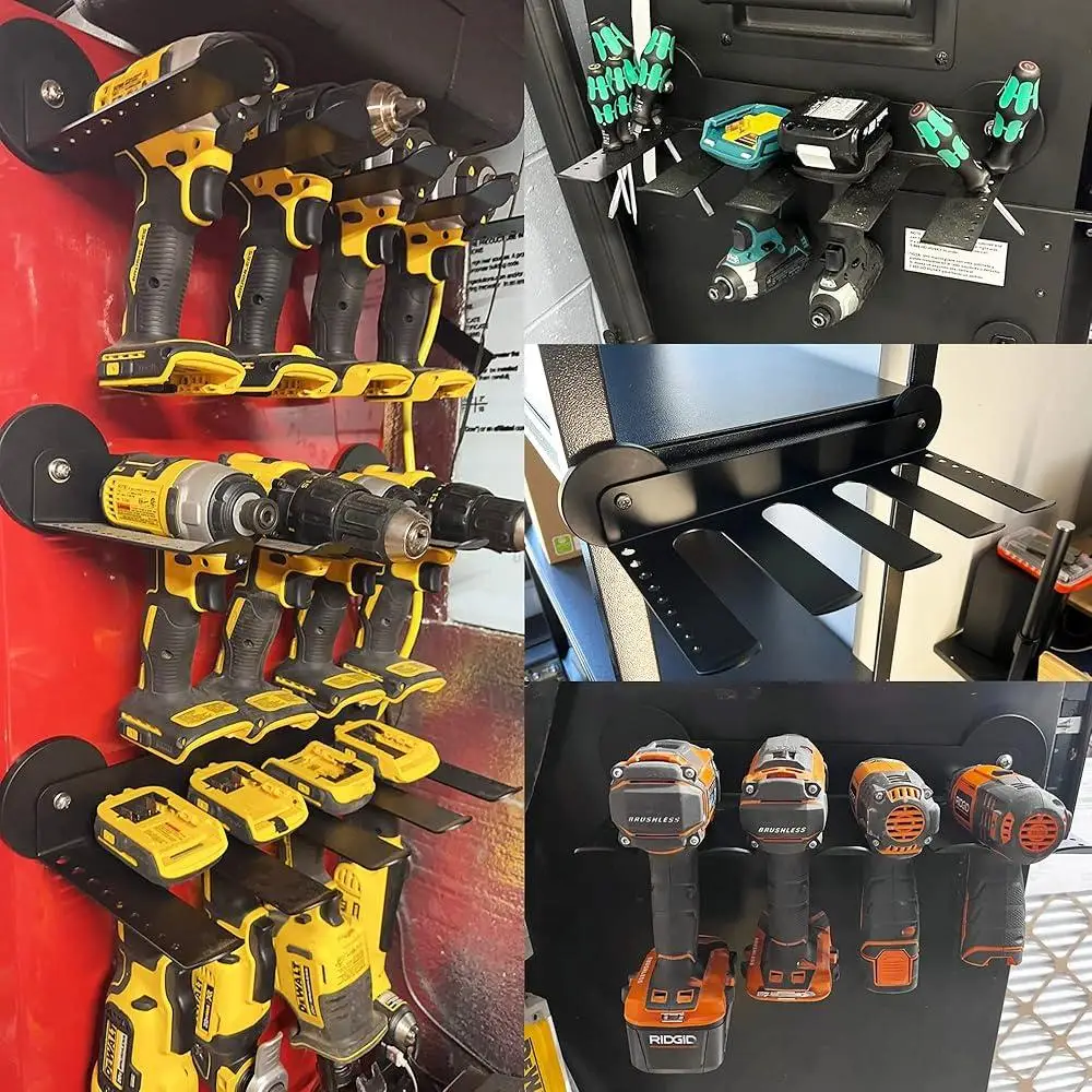 About this item [Magnetic Power Tool Organizer]: Let the power tools have a new foothold, use the magnetic tool organizer to help you save and store all the commonly used tools, organize your messy workbench, Find the tools you need without wasting time [Utility Storage Tool Rack]: Our Utility Storage Rack Shelf is perfect for organizing garage items such as cordless drills, screwdrivers, rolling tools, hardware. Power tool organizer can hang in garages, tool rooms, workshops, warehouses, stores, etc [Heavy Duty Cordless Drill Holder]: Made of heavy duty metal steel, the joints of the frame are reinforced and welded, the tool holder are stronger to prevent the storage rack from breaking easily and protect your power tools [Organize Your Space]: Garage tool organizers have dedicated storage areas for drills and screwdrivers. With space for 4 drills and 9 screwdrivers of different sizes, you can quickly find the tool you need [Easy to Install]: Removable storage rack is detachable and used the included 3. 46inch rubber coated magnet and accessories, which can be used by attaching to the metal surface. No drilling,no screws,the rubber coated won't damage the painted