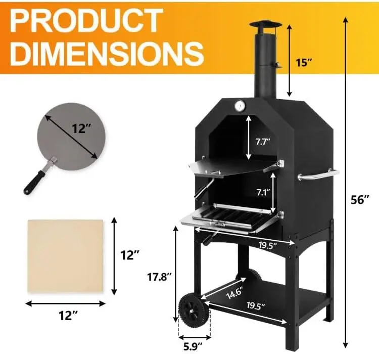 【Package Included】The package comes with a Pizza oven (56"H x 14.6"W x 19.5"L), a pizza stone (12" x 12"),a baking shovel,ash collect tray and a waterproof cover.