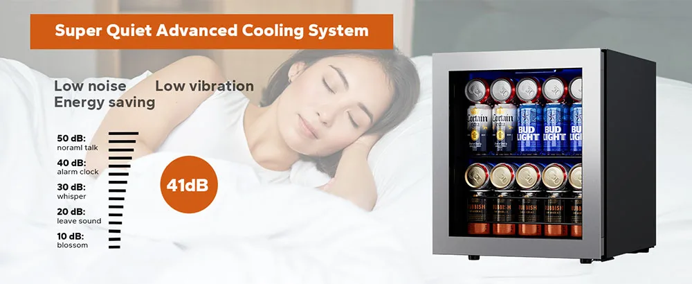 The advanced compressor system operates at under 38 dB, ensuring silent operation. A soft blue LED interior light adds visibility and a modern touch.