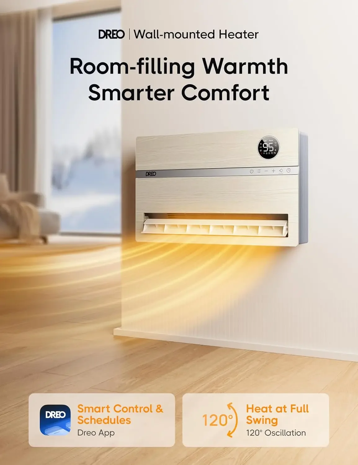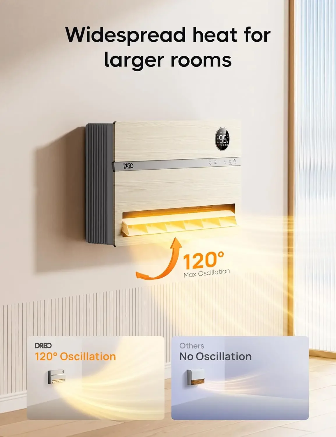 - Widespread Warmth:120° wide oscillation heating distributes warm air evenly from top to bottom, helping to bring fast heat to every corner of your room more efficiently than regular wall-mounted heaters.