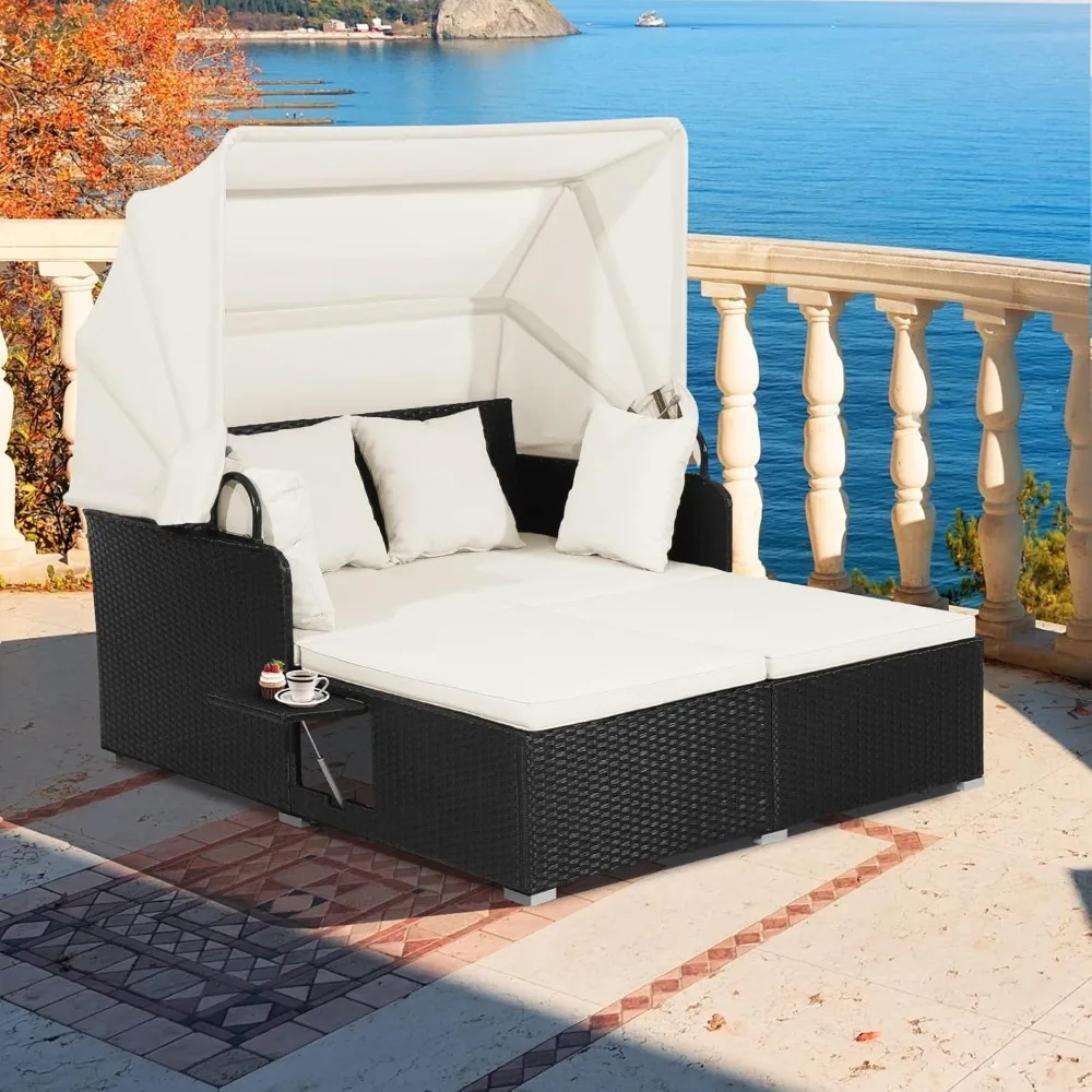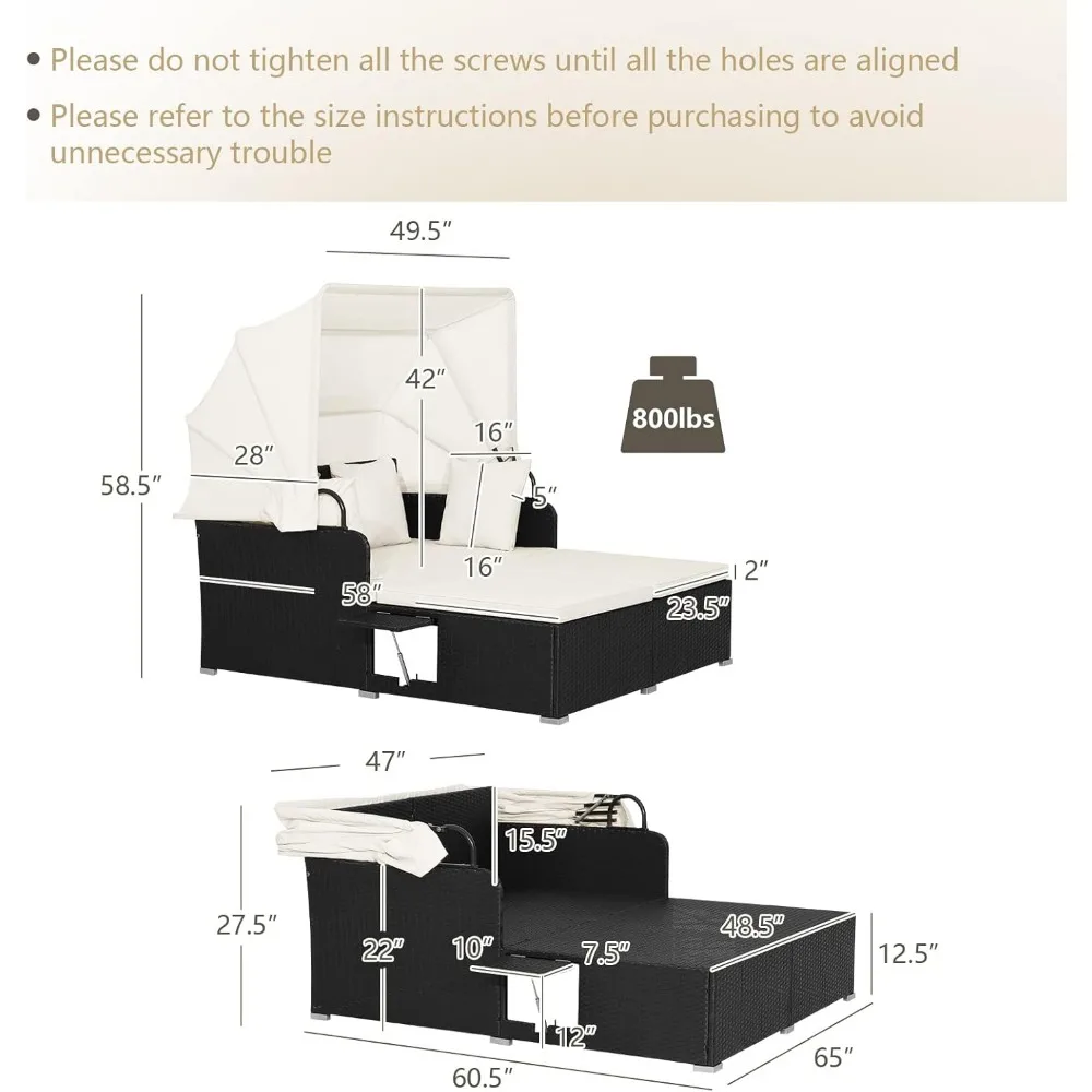 - 【Retractable Canopy & Side Tables】 This outdoor daybed features a retractable canopy with fixed ropes that allows you to read and rest under the shade or just enjoy the sunbath. When the canopy is retracted, it needs to be fixed with ropes. Likewise, the 10" x 7.5" side tables on both sides are retractable as well to make needed close to hand. All you need to do is use the pneumatic rod for safe and easy adjustment.